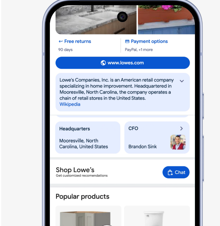 Vemos, nesse caso, um botão logo abaixo do knowledge panel da SERP para a palavra-chave “Lowe’s”.